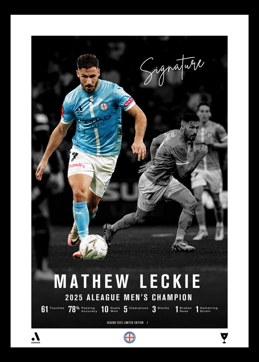 Celebrate Mathew Leckie’s crowning A-Leagues moment with this exclusive signed lithograph, honouring his standout Grand Final performance where he claimed the prestigious Joe Marston Medal. A must-have for any City or Socceroos fan, this framed piece is the perfect tribute to one of Australian football’s finest.