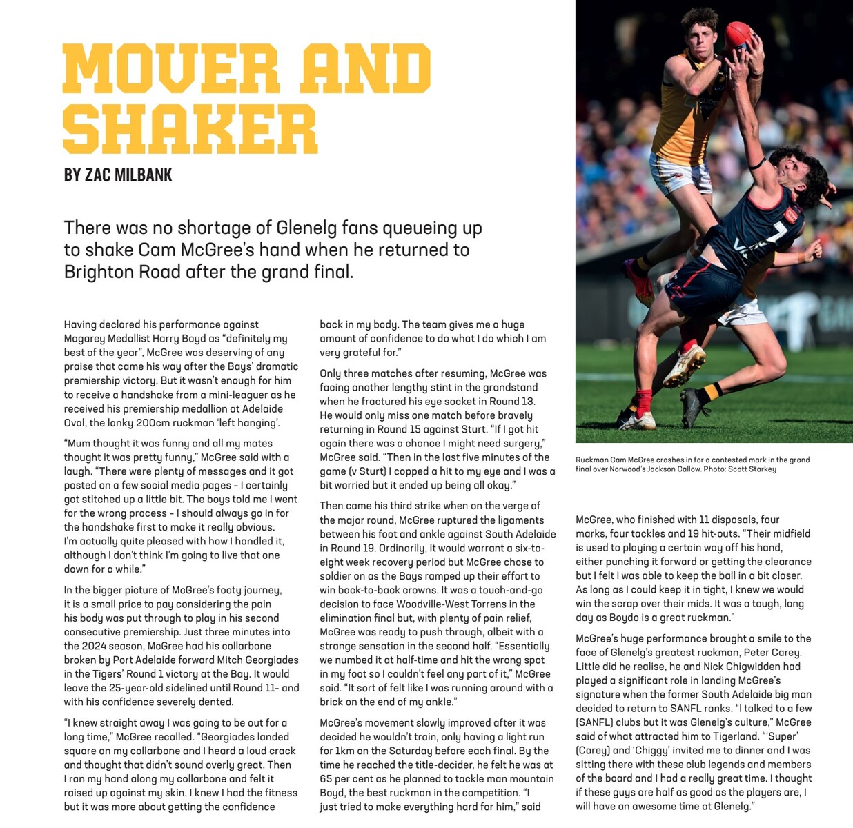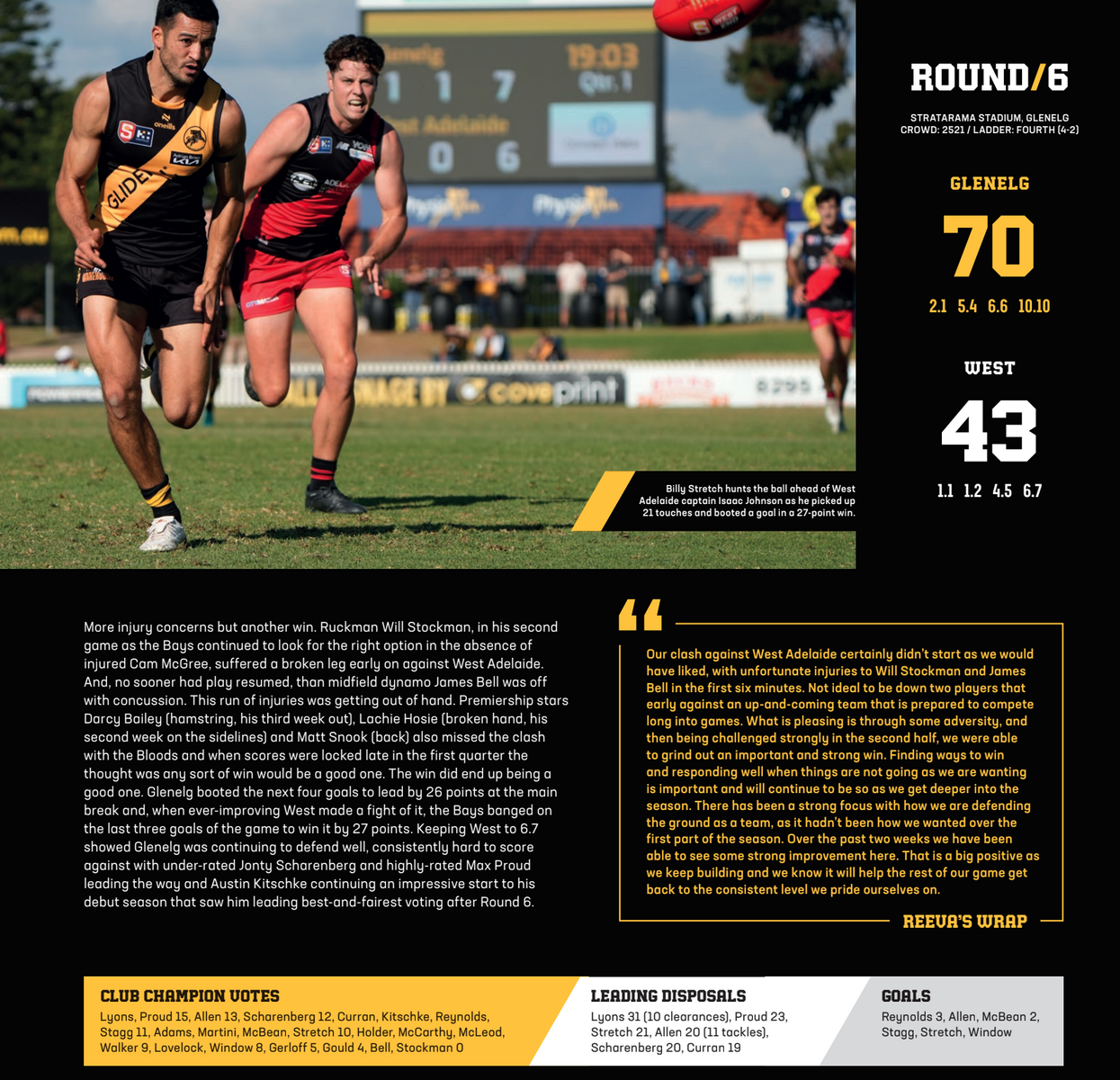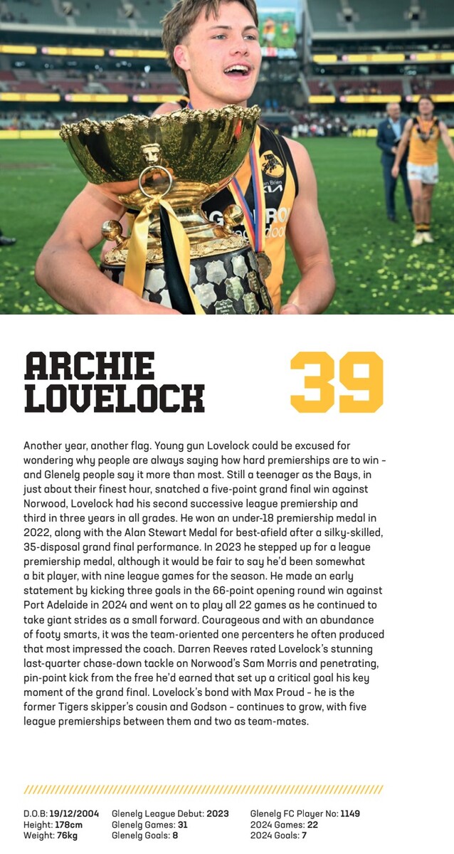 - player profiles. There are feature stories on the Magnificent 7 – Glenelg's triple premiership players – Liam McBean, Reeves, Matthew Snook, James Bell, Matt Allen, Lachie Hosie, Chris Curran and Max Proud, Will Chandler, Cam McGree and more.